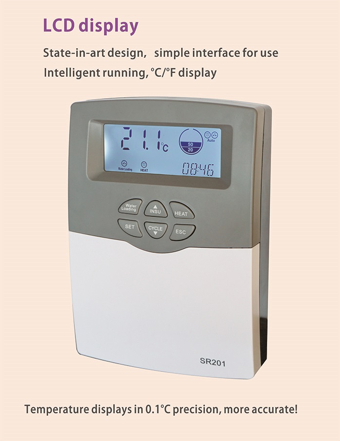 With a clear LCD display, sleek design, and easy installation, the SR201 controller has become the preferred choice for solar water heater manufacturers and installers worldwide. It is available in both Chinese and English language versions, making it suitable for both domestic and international markets.