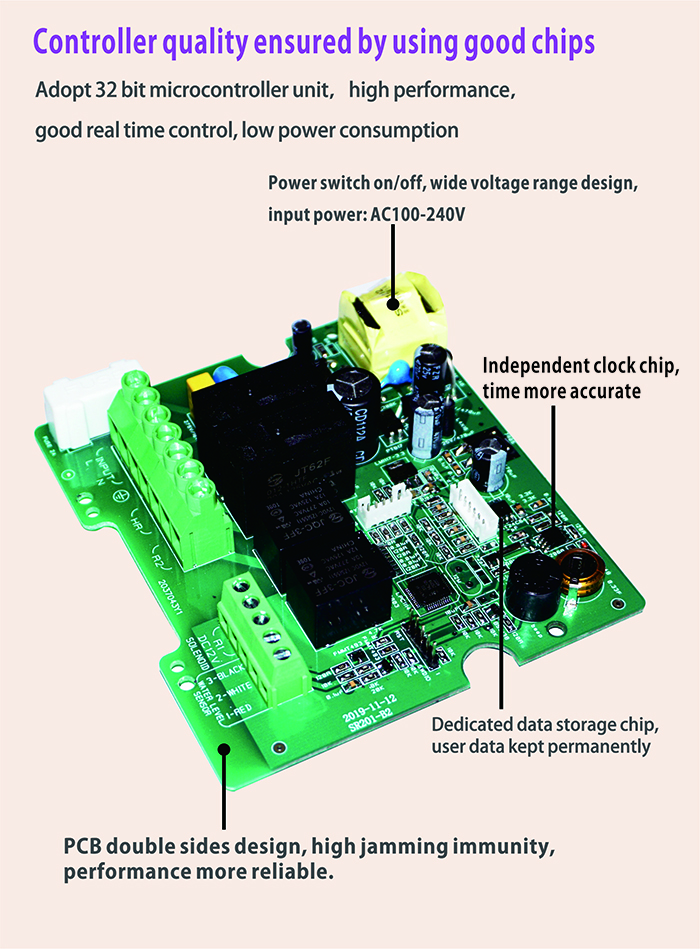 All electronic components are manufactured to industrial standards, ensuring stable performance even in harsh environments, including cold temperatures, high heat, and high humidity. A dedicated clock chip guarantees accurate time-based control, making the SR201 ideal for applications requiring scheduled filling, heating, and pipe insulation.