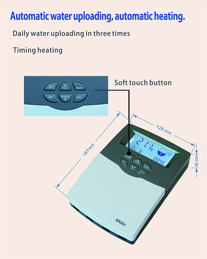 The SR201 solar water heater controller is a microcomputer-based, fully automatic control system specially designed for integrated non-pressure solar water heaters. Built with a high-performance 32-bit single-chip microcomputer, this intelligent controller delivers precise, reliable operation for residential and commercial solar heating systems.